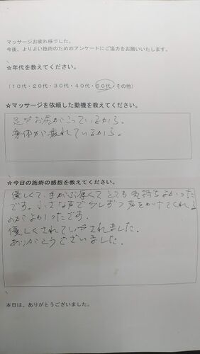 50代女性の性感マッサージ体験談です。 ☆マッサージを依頼した動機を教えて下さい 足やお尻がこっているから。 身体が疲れているから。 ☆今日の施術の感想を教えて下さい 優しくて、手がぶ厚くて、とても気持ちよかったです。 小さな声で少しずつ声をかけ…