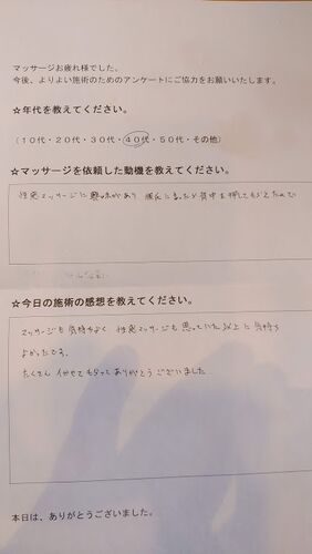 ☆マッサージを依頼した動機を教えてください。 性感マッサージに興味があり、彼氏に言ったら背中を押してもらえたので ☆今日の施術の感想を教えてください マッサージも気持ちよく、性感マッサージも思っていた以上に気持ち よかったです。 たくさん、イカせ…