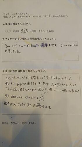 性感マッサージの体験談 ―――――――――――――――――――――――――――――――――――――― ☆年代 30代 ☆マッサージを依頼した動機を教えてください 毎日、とてもしんどかったので、身体も心もリフレッシュしたいと思いました。 ☆今日の施術の感想を教えてください。 オイルマッサ…