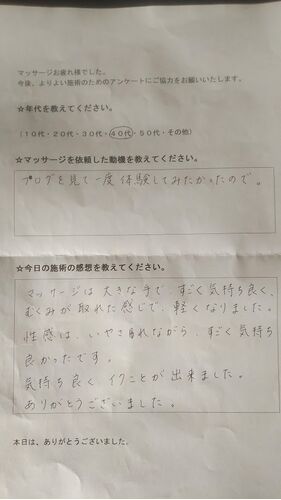 性感マッサージ体験談。 ☆年代 40代 ☆施術を依頼した動機を教えてください。 ブログを見て一度、体験してみたかったので。 ☆今日の施術の感想を教えてください。 マッサージは、大きな手で、すごく気持ち良く、 むくみが取れた感じで、軽くなりました。 性…