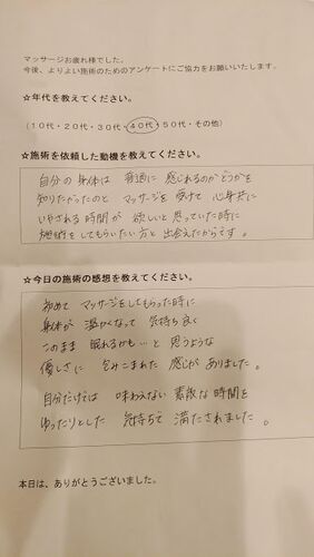40代女性の性感マッサージ体験談 ☆施術を依頼した動機を教えてください。 自分の身体は、普通に感じられるかどうかを 知りたかったのと、マッサージを受けて心身共に いやされる時間が欲しいと思っていた時に 施術をしてもらいたい方と出会えたからです。 …
